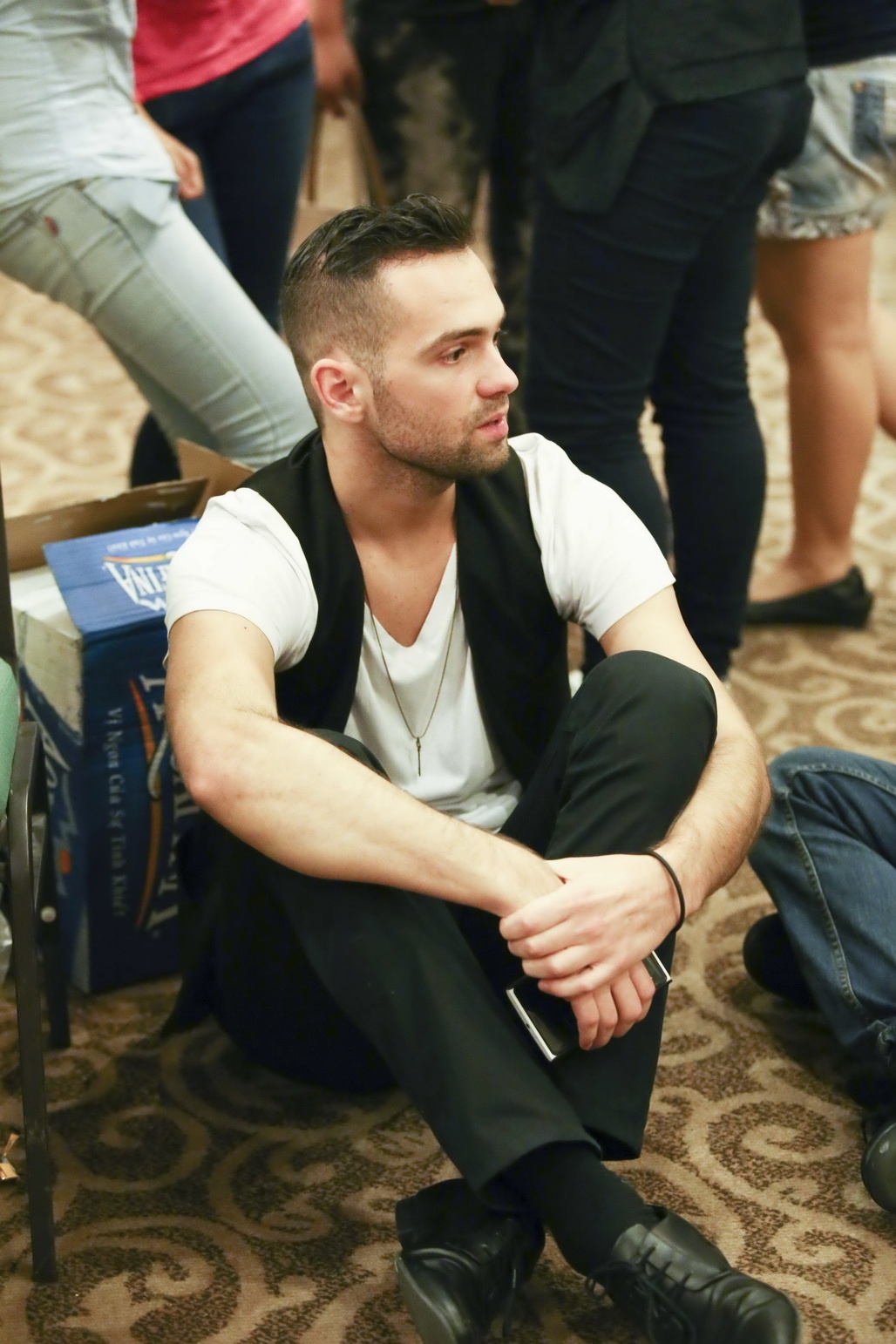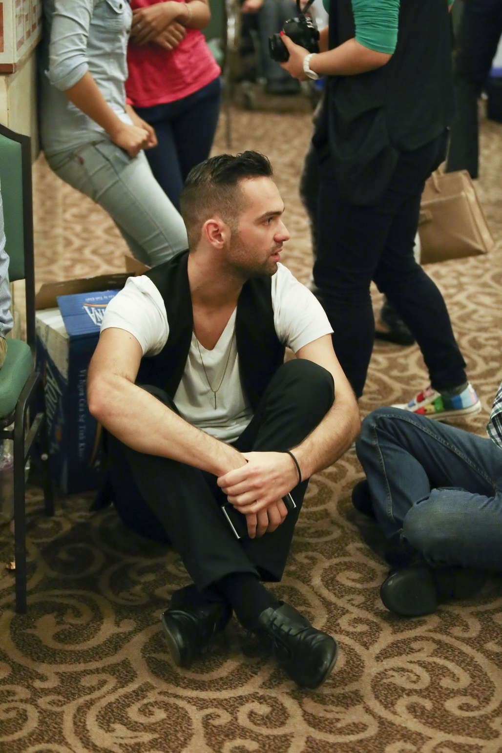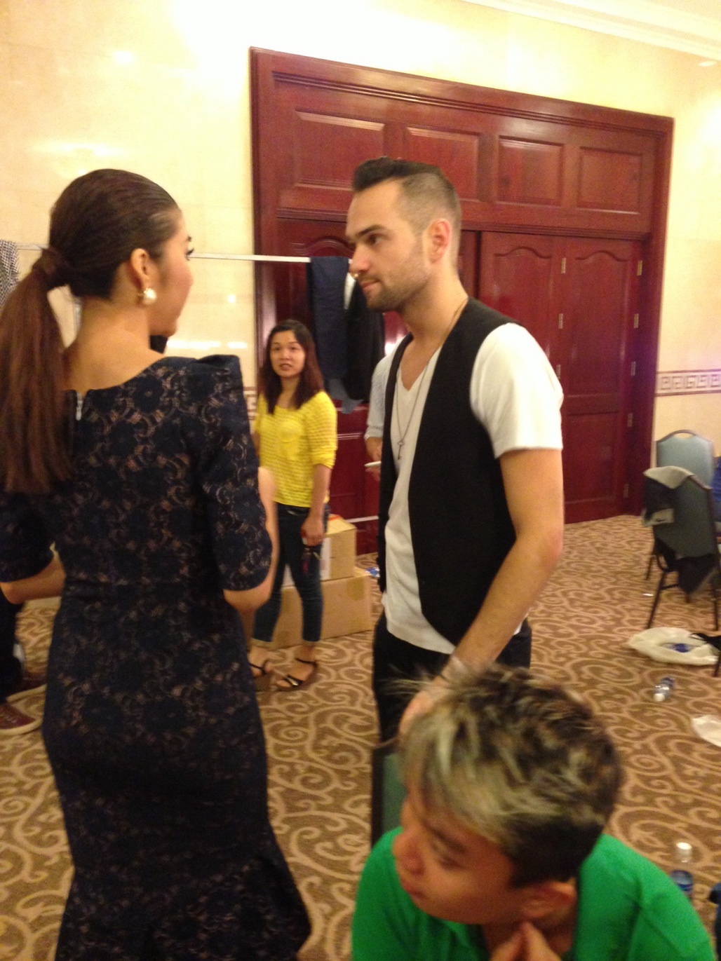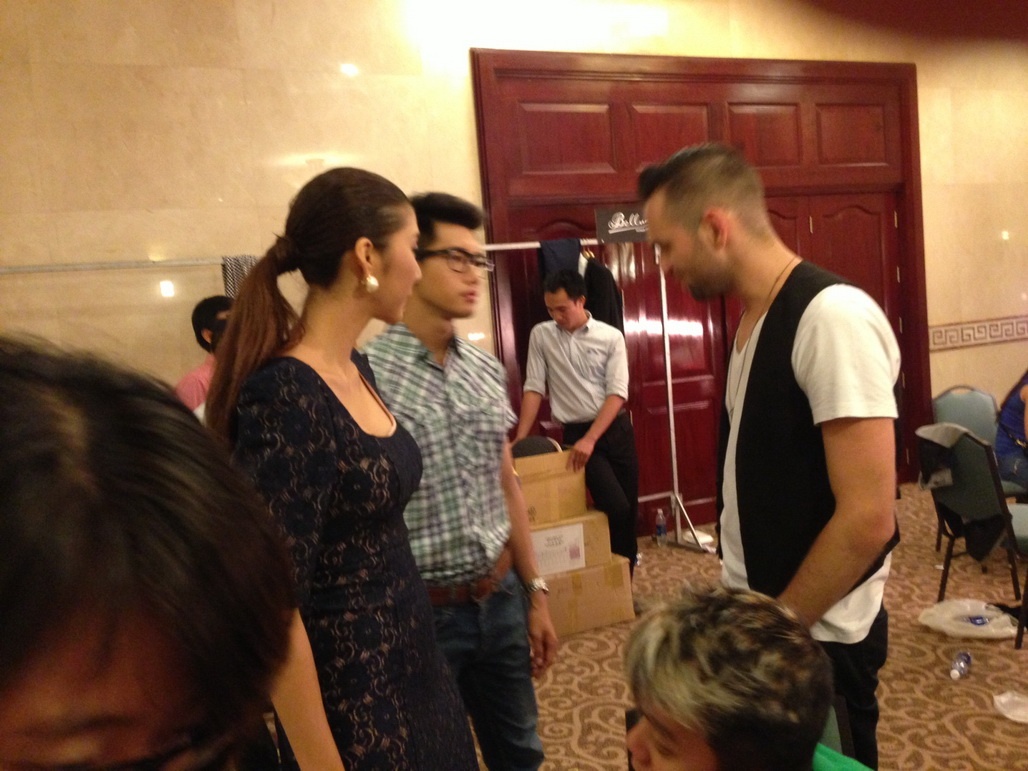 Daniel không ngần ngại ngồi bệt dưới sàn và trò chuyện cùng các cộng sự của Ngọc Quyên bằng thứ tiếng Việt bập bẹ trong khi cô đi thay đồ sau đêm diễn.