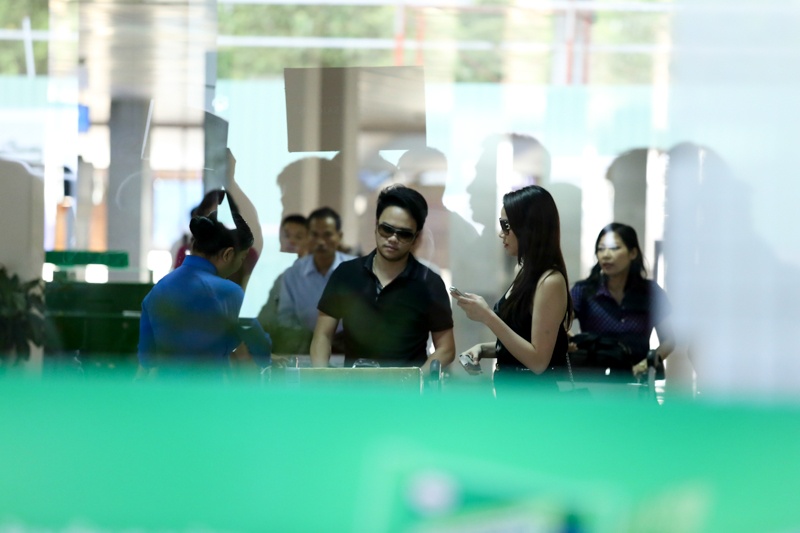 Bạn trai Trang Nhung cũng có mặt bên cạnh cô trong chuyến đi này. Trong khi người đẹp bận rộn với điện thoại, anh cẩn thận lấy đồ rồi đẩy xe hành lý hộ Trang Nhung. Người đẹp công khai mối quan hệ với anh chàng này từ hồi tháng 6/2013.