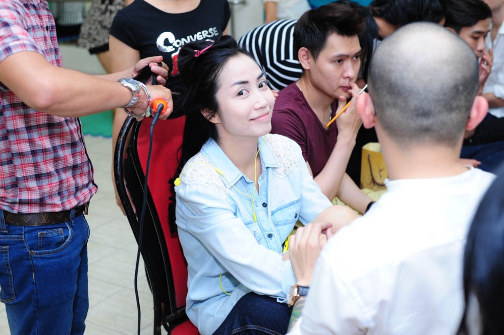 | Ốc Thanh Vân được ê-kíp hỗ trợ chỉnh trang lại trang phục trong những phút cuối trước khi chương trình trực tiếp bắt đầu. |