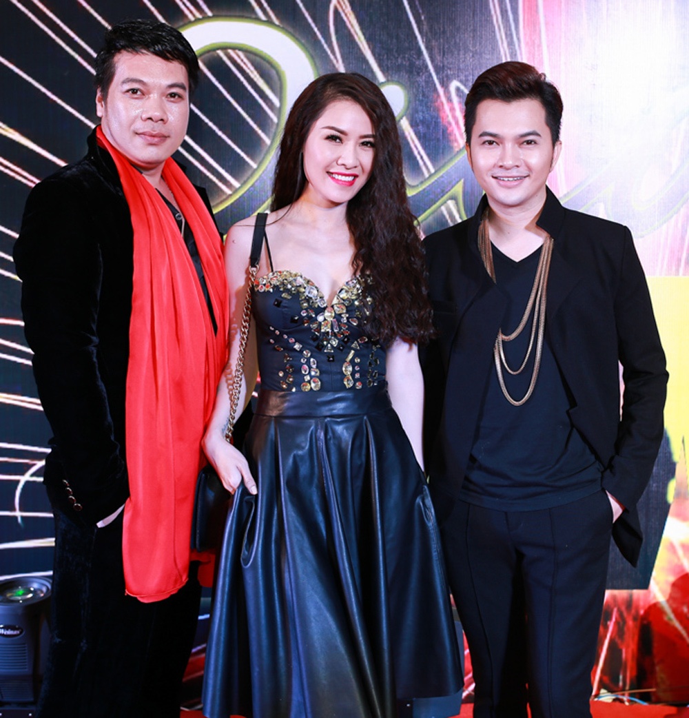 | Nam Cường và Quế Vân ton sur ton đến dự tiệc. Cặp đôi chụp hình cùng doanh nhân, ca sĩ Vỹ Khang. |
