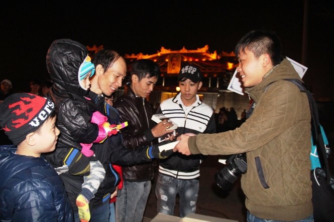 Bạn Tuấn Anh, thành viên chương trình (phải) tặng sách cho người dân, du khách đến quảng trường Ngọ Môn đón giao thừa. Ảnh: Tuổi Trẻ. |
