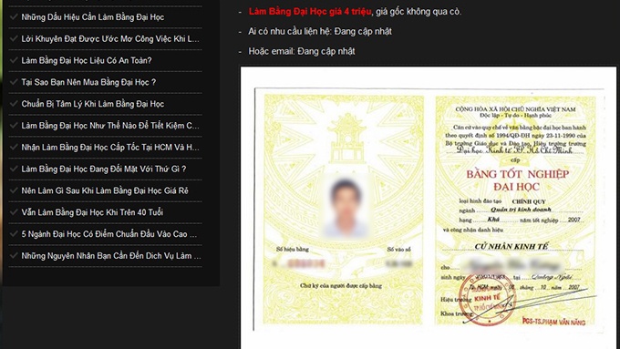 Một số đối tượng quảng cáo làm bằng giả bằng phôi bằng thật, bảng điểm thật của trường. PGS-TS Đỗ Văn Xê, phó hiệu trưởng Trường ĐH Cần Thơ, khẳng định, việc phôi bằng thật lọt ra ngoài là điều rất khó xảy ra.