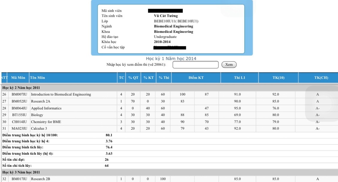 | Một trong những bảng điểm xuất sắc của Vũ Cát Tường khi học đại học. |
