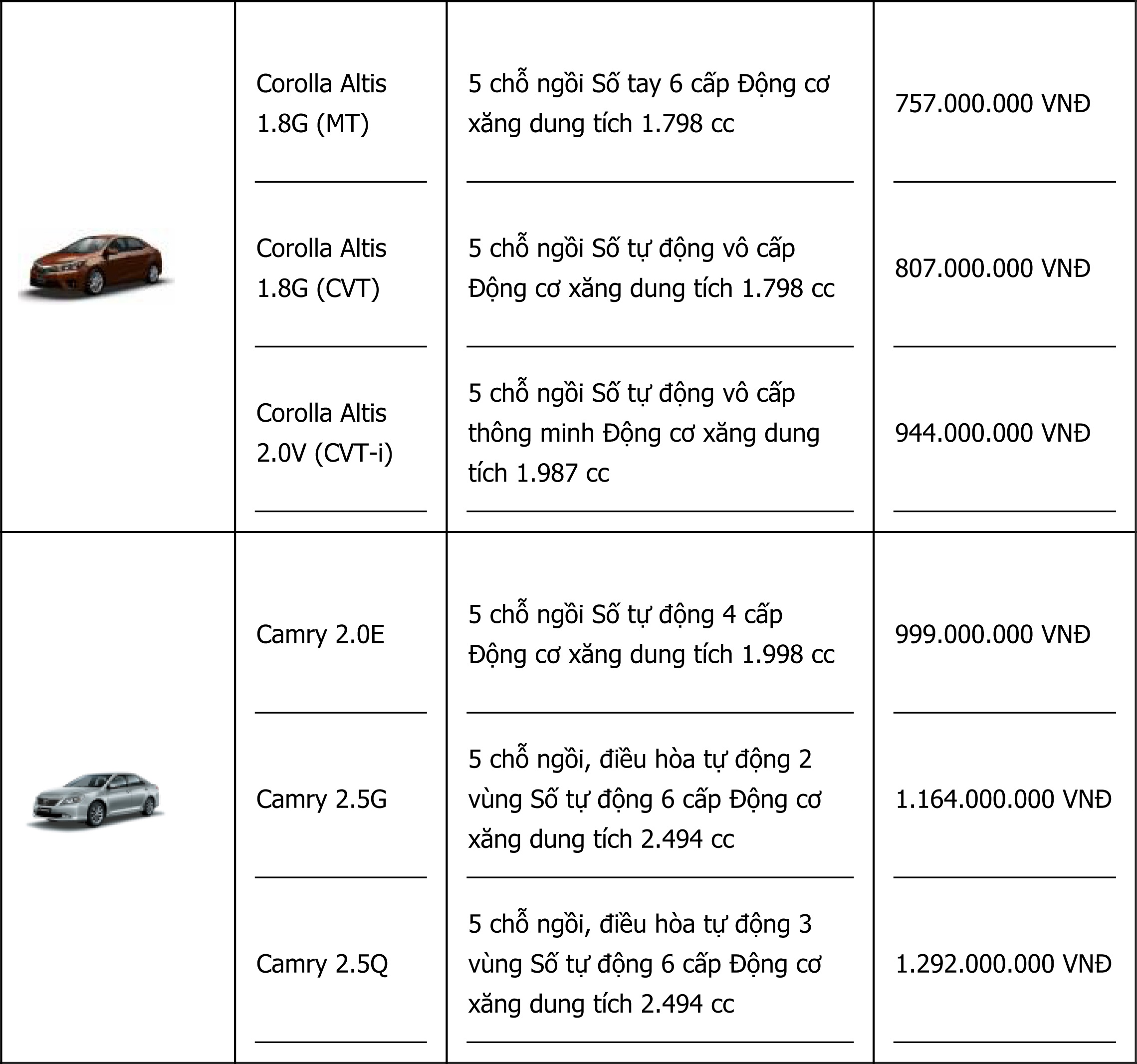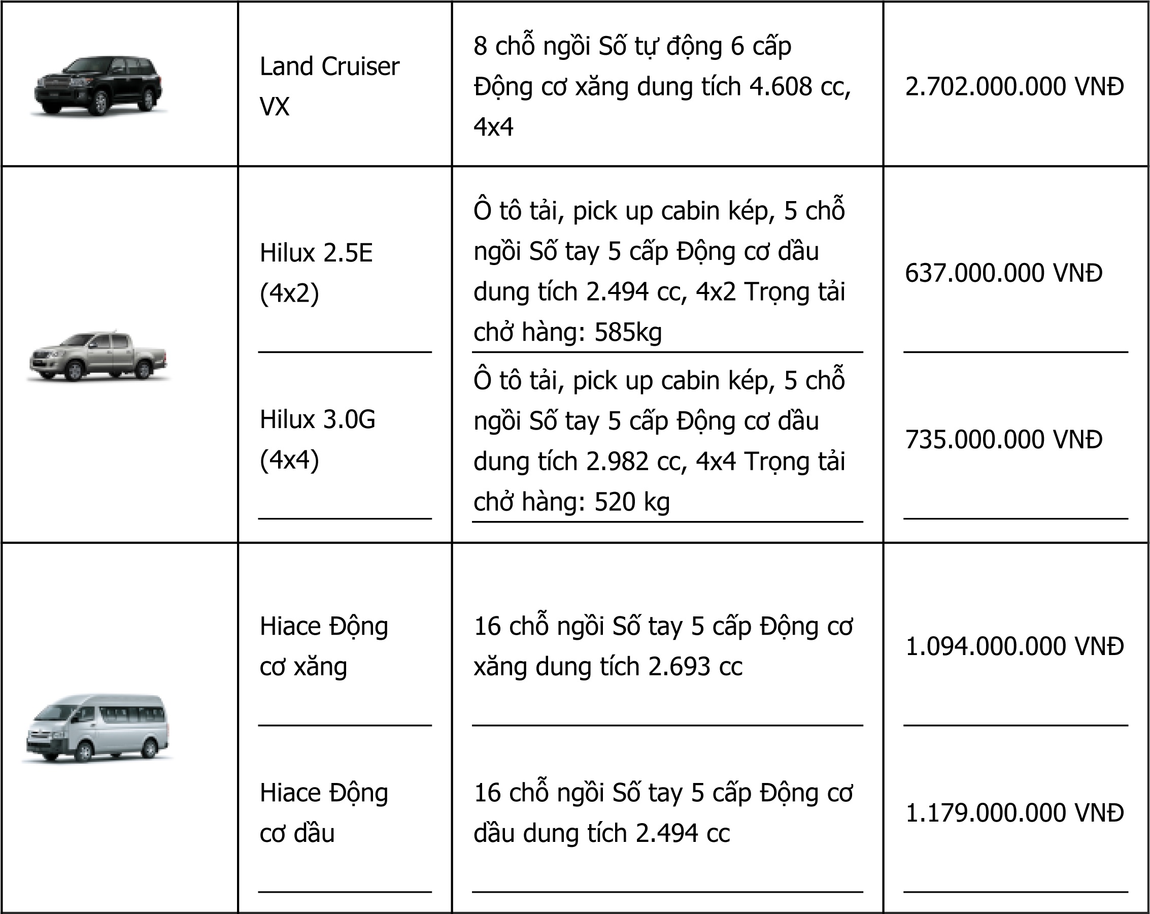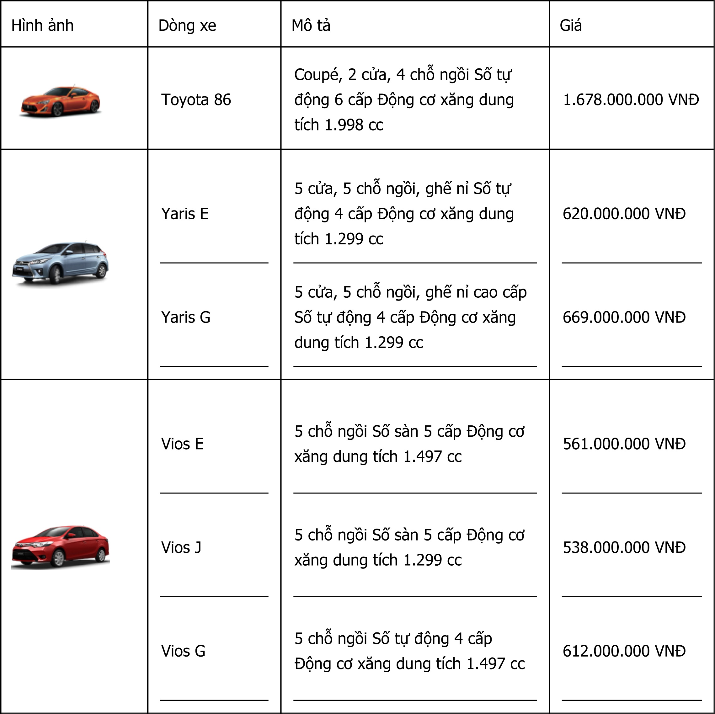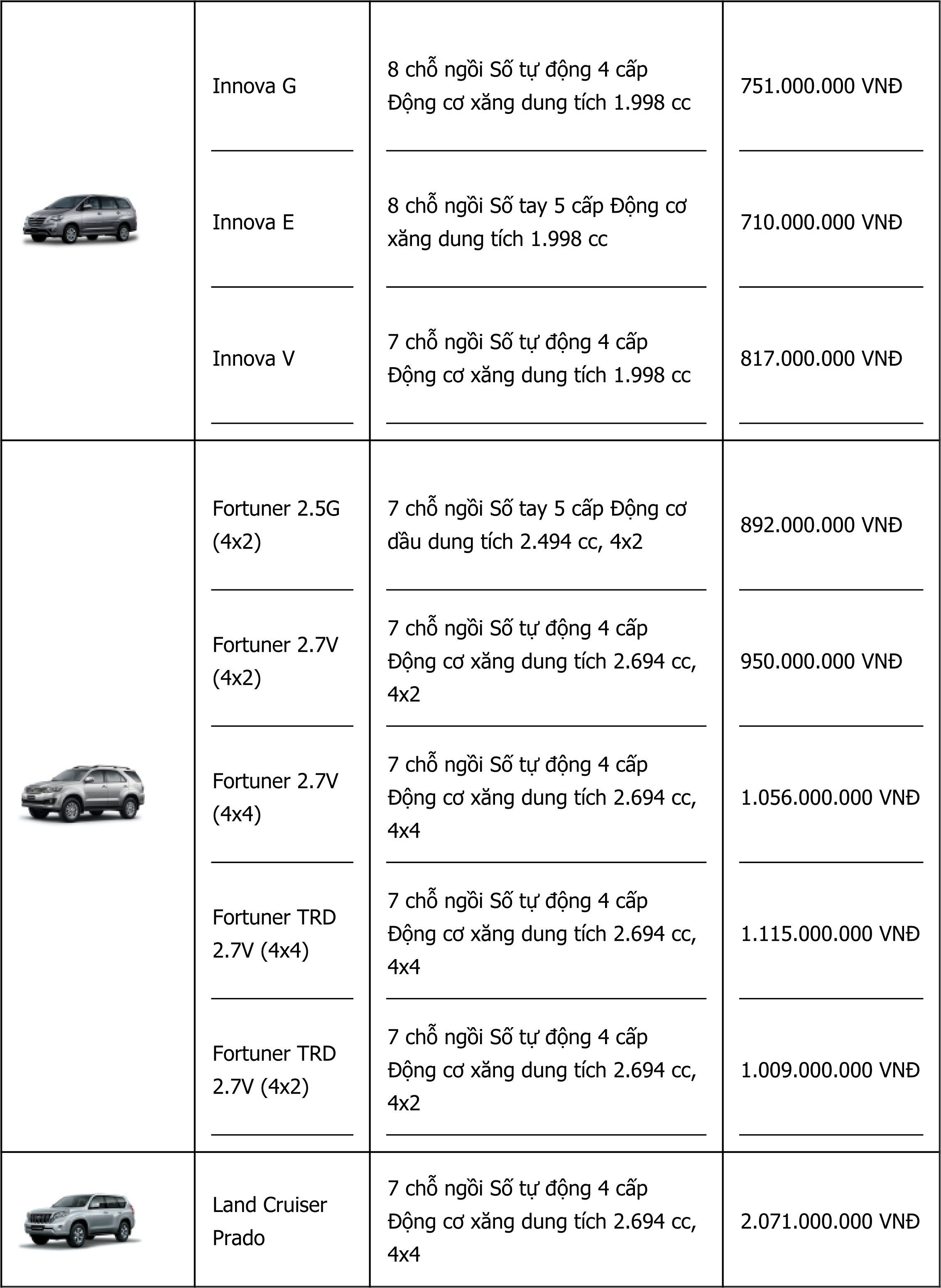 Bảng giá các mẫu xe Toyota chính hãng. Nguồn: Toyota Việt Nam.