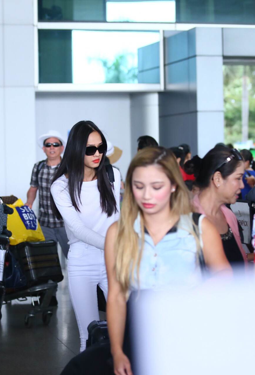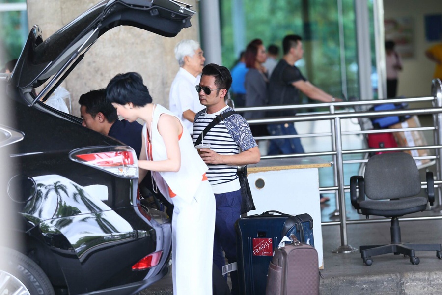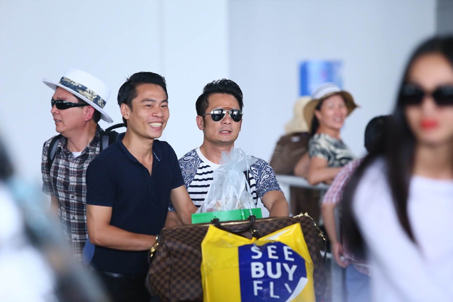 | Bằng Kiều thoải mái hơn với áo thun họa tiết và quần jeans hiện đại. Anh được một người bạn giúp đỡ xếp hành lý nên có mặt tại sảnh sân bay sau bạn gái chân dài vài phút. |