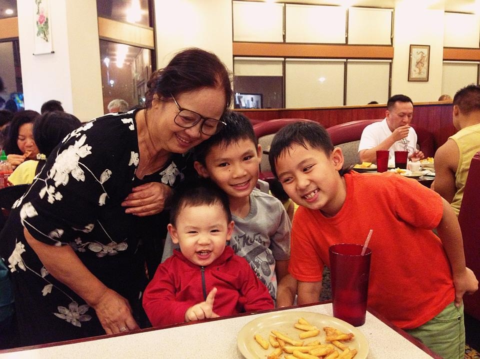 | Mẹ Bằng Kiều hiện đang sống ở Mỹ cùng anh, đưa các cháu nội đi chơi. |