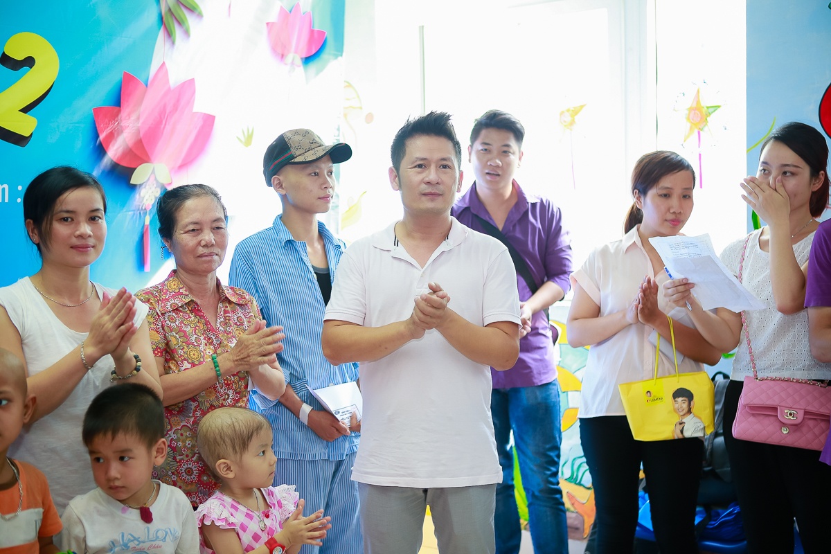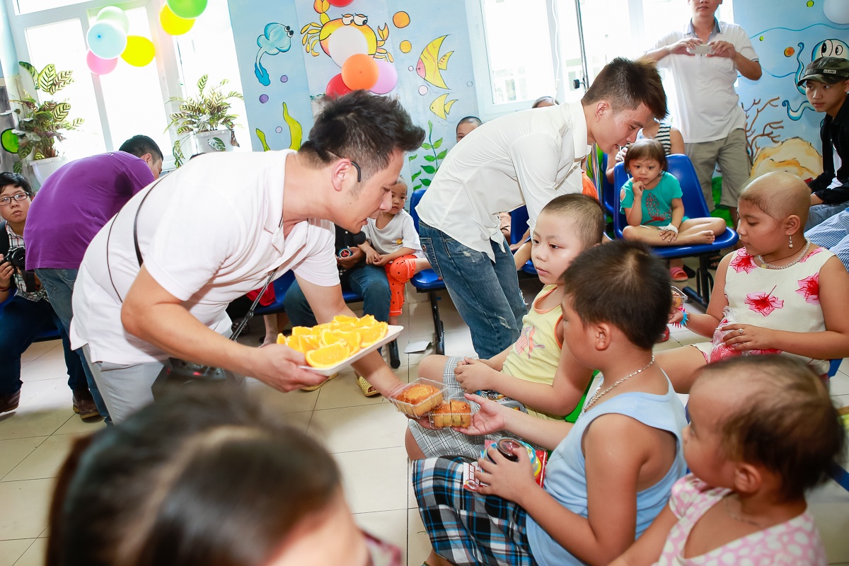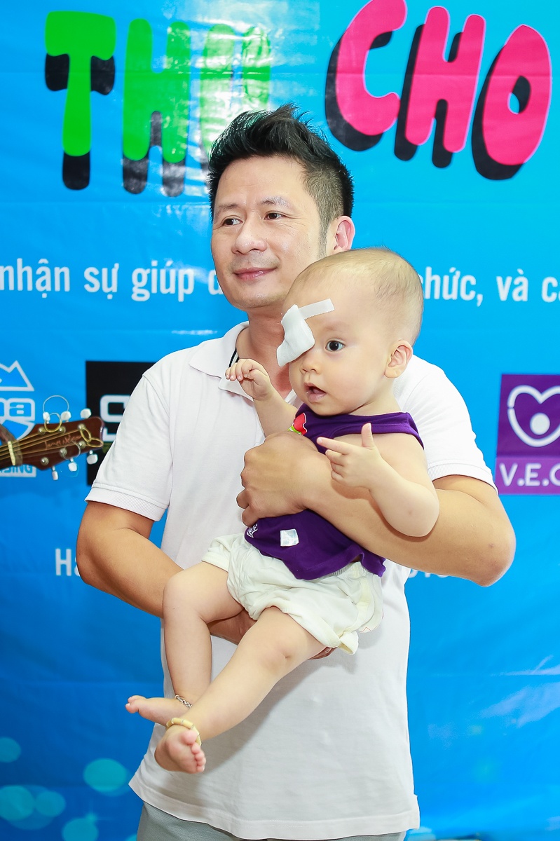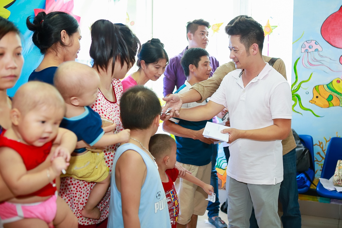 | Anh đã hát nhiều ca khúc thiếu nhi, tự tay trao quà và bế ẵm nhiều trẻ em tại bệnh viện. |