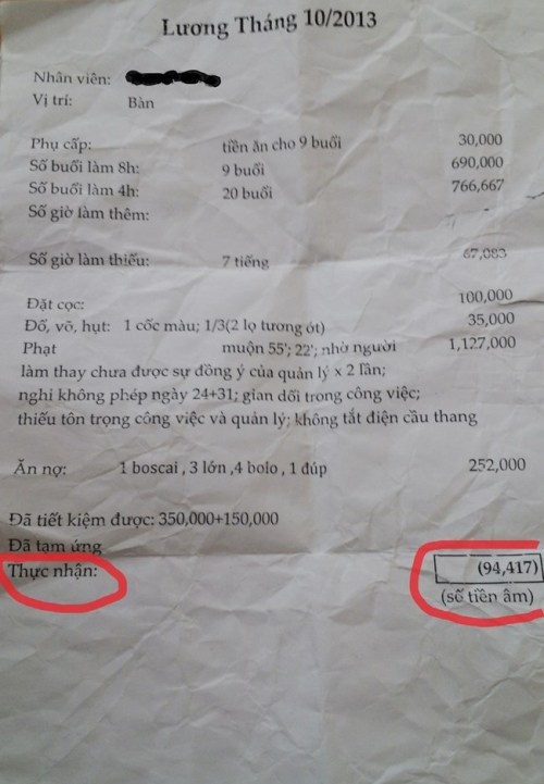 Nhìn vào bảng thống kê chi tiết, ai cũng nhận ra sự chênh lệch giữa khoảng phụ cấp, tiền mỗi giờ làm và phần phạt vì đi trễ, làm hỏng đồ... Trong đó, tiền ăn cho một nhân viên trong 9 buổi chỉ có 30.000 nghìn đồng, lương mỗi giờ làm chưa đến 10.000 đồng nhưng đi trễ 77 phút trong một tháng thì bị phạt những 1,127 triệu đồng. Kết cục, tổng số tiền lương được nhân và số tiền nhân viên đó bị phạt ra số tiền âm nhà nhân viên phải nộp lại cho chủ vào cuối tháng.