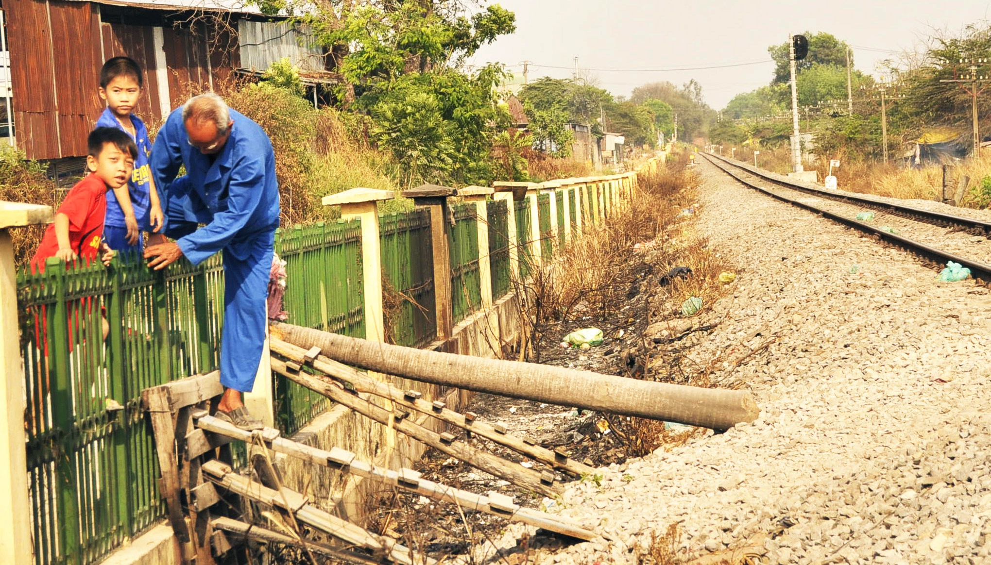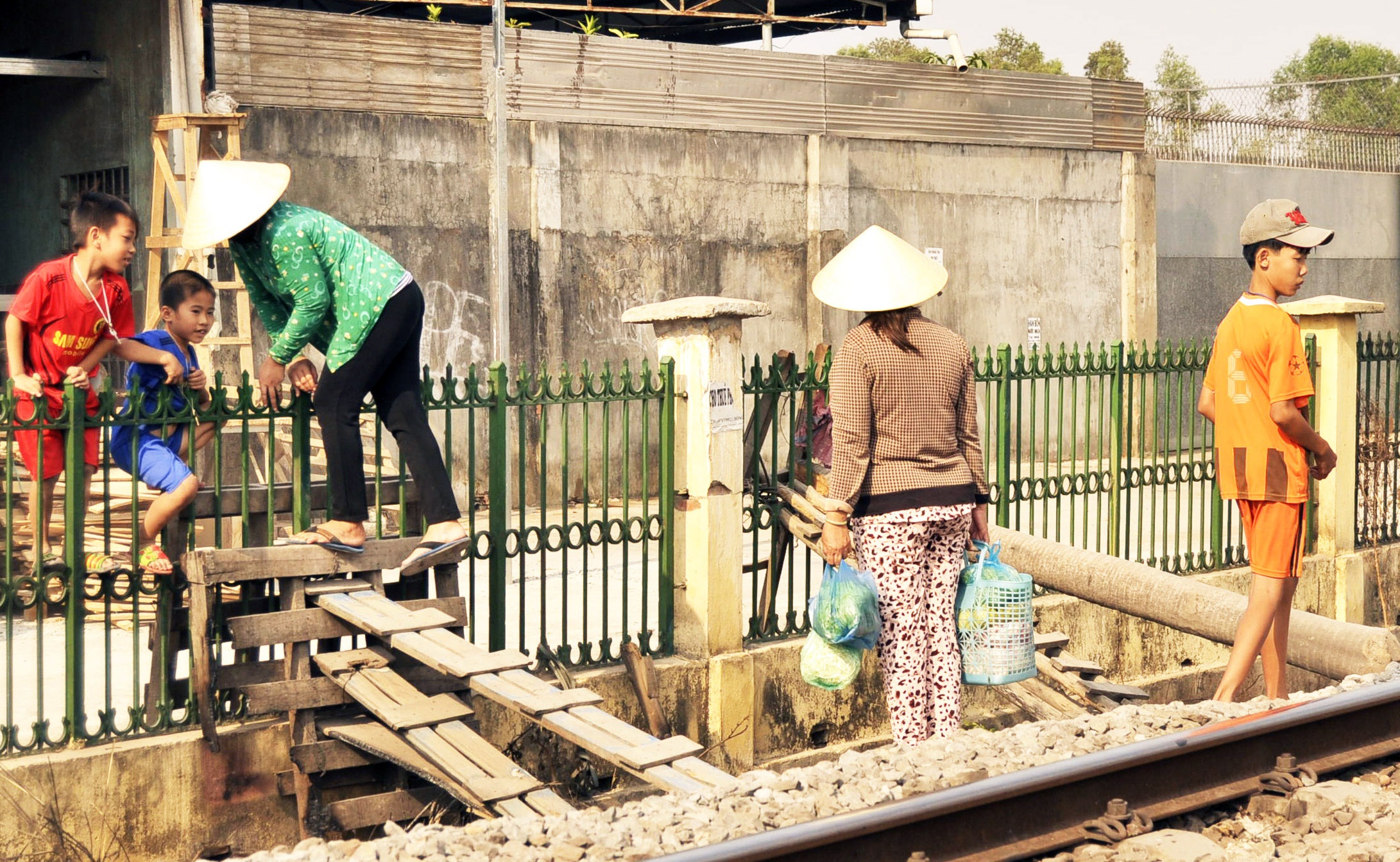 | Mặc dù có một đường ngang dân sinh gần đó dành cho người và phương tiện qua lại, nhưng một số hộ dân vẫn tự lót đá, ván băng qua đường ray vì không muốn đi xa. Trong ảnh: Ba ông cháu cùng leo rào. |