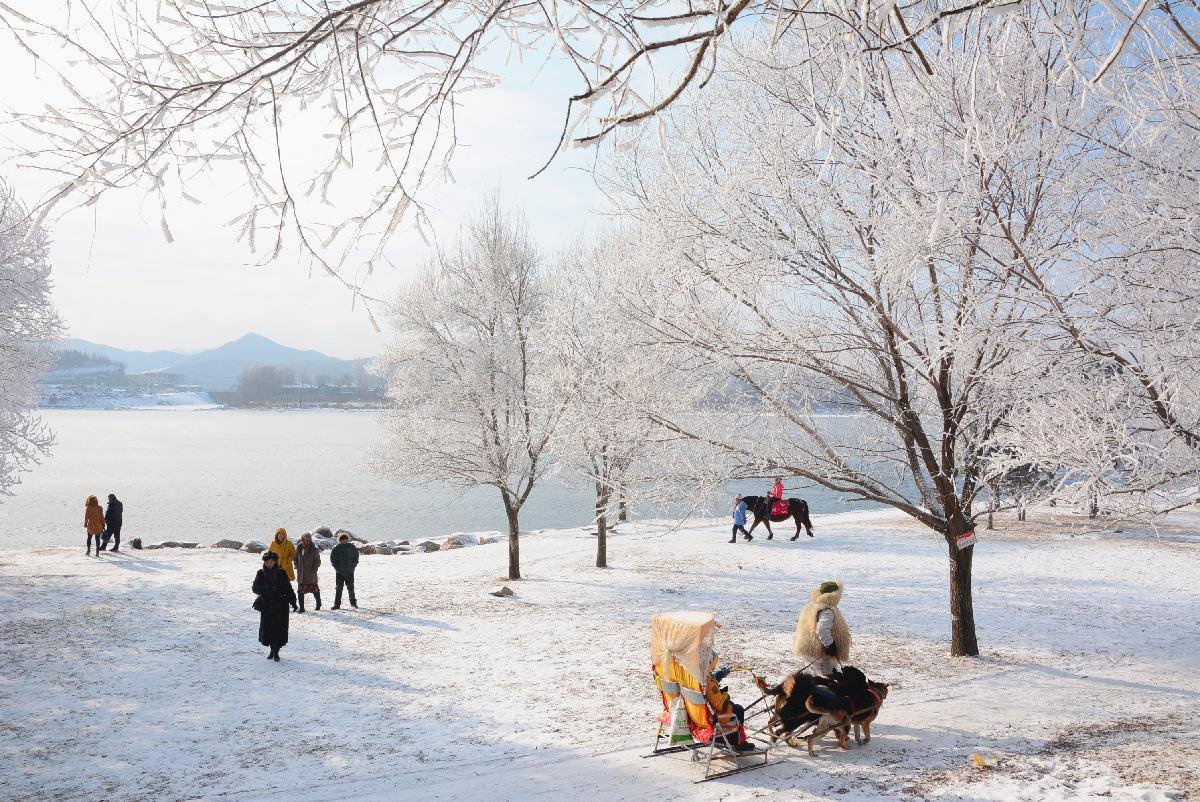 | Người dân tản bộ cạnh sông Tùng Hoa giữa khung cảnh lạnh giá nhưng tuyệt đẹp ở tỉnh Cát Lâm. Ảnh: Xinhua. |