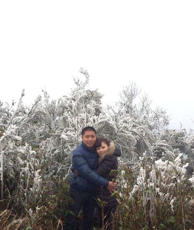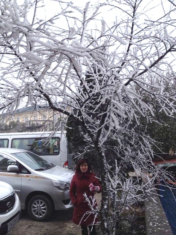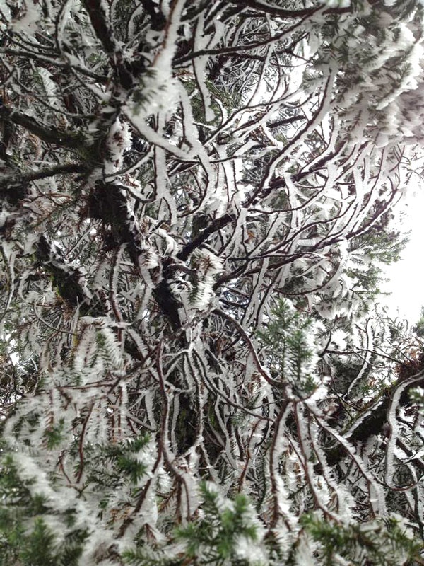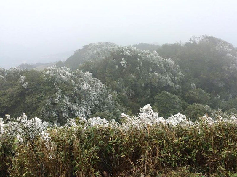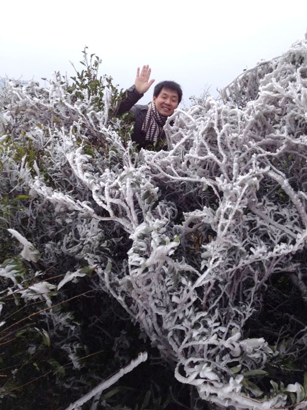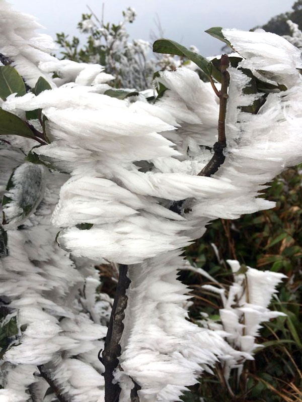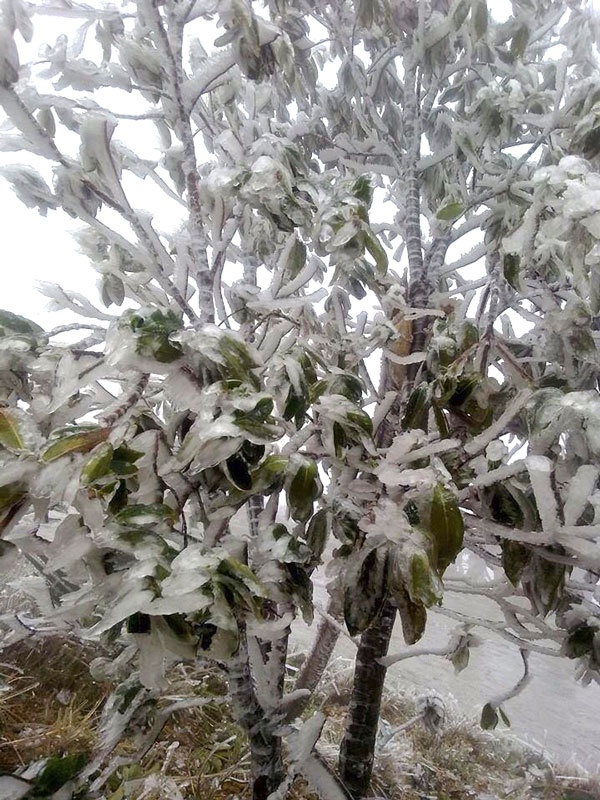 Đến trưa 11/2 nhiệt độ tại đỉnh Mẫu Sơn chỉ còn 1-2 độ C. Phải lên đến đỉnh núi mới tận mắt trông thấy băng tuyết bám dày trên các cành cây.