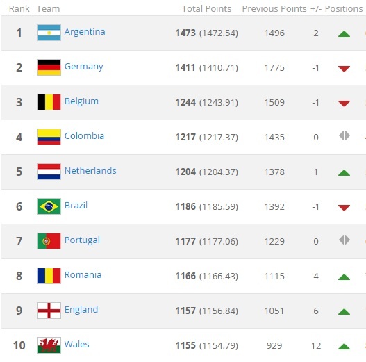 Top 10 thế giới có sự thay đổi mạnh. Bất chấp thua Chile trong trận chung kết Copa America, Argentina vẫn tăng 2 bậc để lần đầu vươn lên vị trí số 1 trên bảng xếp hạng FIFA sau 7 năm. Lần gần nhất Albiceleste dẫn đầu thế giới vào tháng 6/2008.