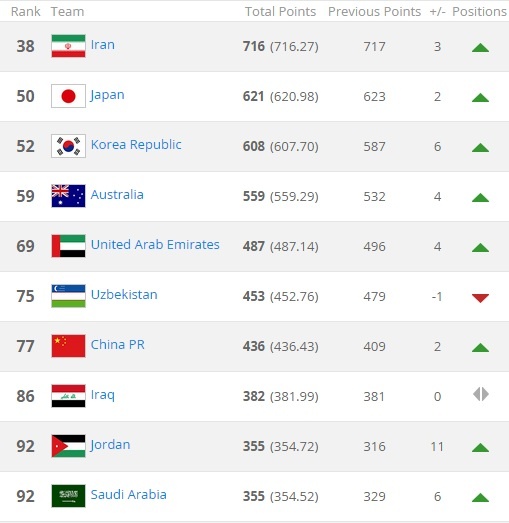 Ở khu vực châu Á, Iran (38 thế giới) tăng 3 bậc trên bảng xếp hạng FIFA, qua đó vươn lên dẫn đầu. Các vị trí tiếp theo lần lượt thuộc về Nhật Bản (50), Hàn Quốc (52), Australia (59) và UAE (69). Giống Iran, bốn đội trong Top 5 châu Á đều có những bước tiến đáng kể so với tháng trước.