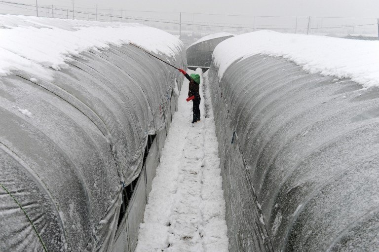 Tuyết phủ trắng trên mái nhà kính ở Đông Dương, tỉnh Chiết Giang, Trung Quốc. Ảnh: AFP |