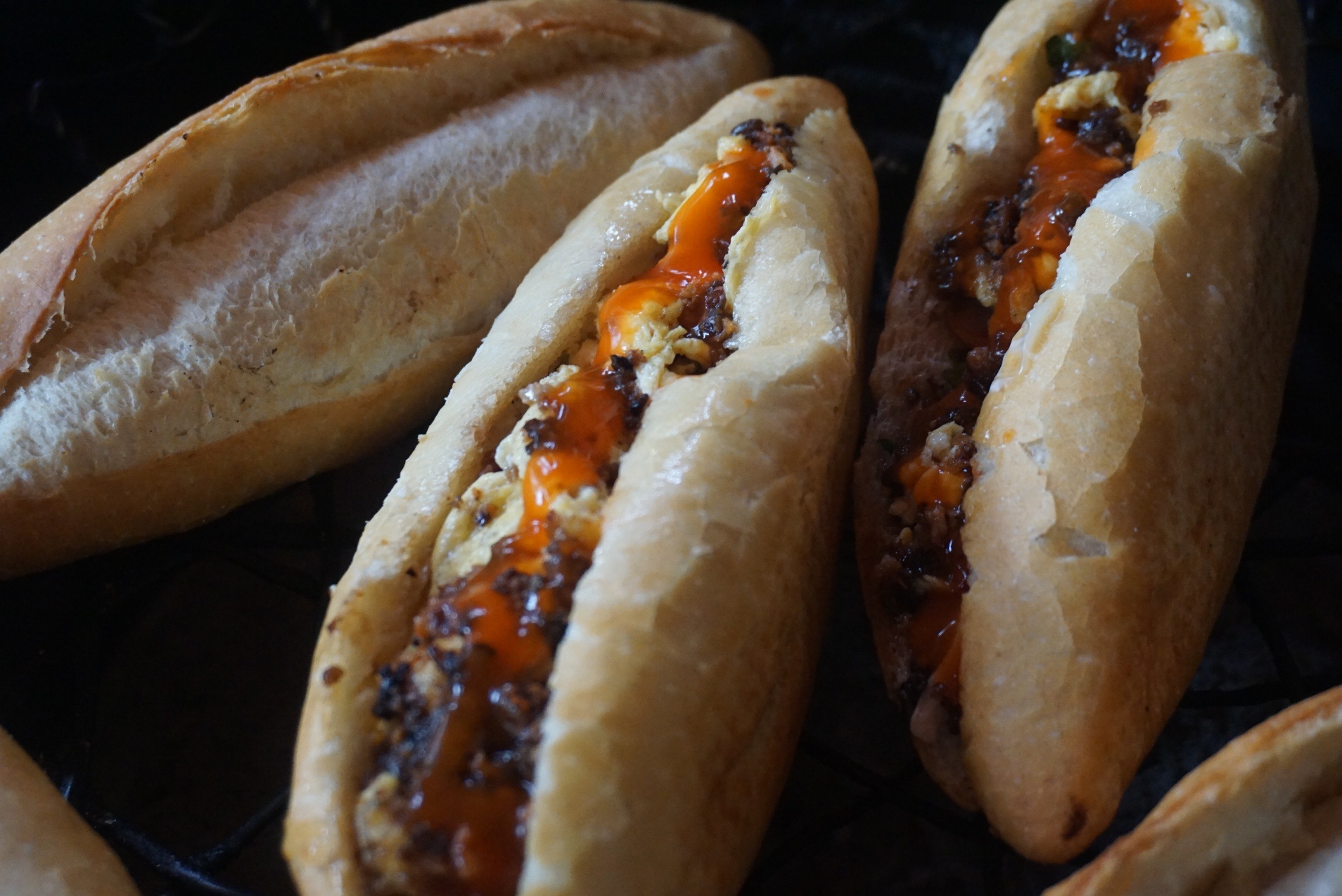 Chúng tôi đến quán “madame Khanh – The queen of banhmi” khi phố đã lên đèn, những vị khách Tây vừa chụp xong bức hình lưu niệm với bà chủ, vui vẻ chào bà ra về. Bà Khánh quay lại tươi cười với nhóm khách tới muộn: “Chờ bà chút nghe, bà chiên thêm trứng vì hết nhân rồi. Nhưng bánh chỉ còn 2 ổ mà nhóm lại 6 người. Hay sớm mai quay lại, bà làm cho ăn đầy đủ. Bánh mì phải ăn đủ hết các vị mới ngon! Hai ổ bánh này bà ưu tiên, miễn phí cho 2 em bé”.