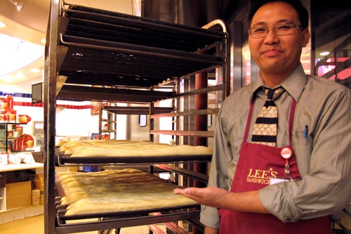 Tại Mỹ có nhiều thương hiệu bánh mì Việt Nam, nhưng chuỗi cửa hàng của Lê Chiêu và gia đình được xem là một trong những chuỗi thành công nhất. Noel Santos - quản lý tại Lee ở Irvine, với một khay bánh mì que tươi tại khu Little Saigon (California, Mỹ).