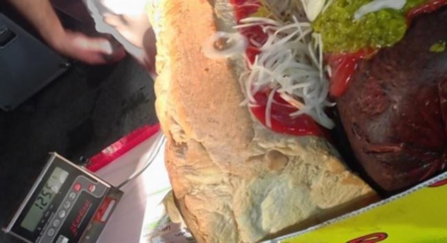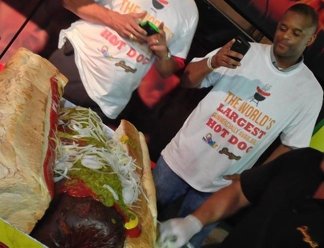 | Ngày 21/3, công ty Juicy’s Outlaw Grill làm chiếc bánh mỳ kẹp xúc xích trong một hội chợ triển lãm ở quận Miami-Dade Florida, Mỹ. Chiếc bánh mỳ kẹp xúc xích có đầy đủ gia vị: nước tương cà chua, mù tạt, hành tây, nặng 56,5 kg. Juicy’s Outlaw Grill đang chờ tổ chức Kỷ lục Guinness xác nhận đây là chiếc bánh mỳ kẹp xúc xích lớn nhất thế giới. |