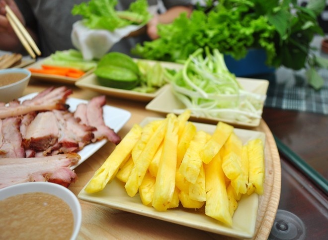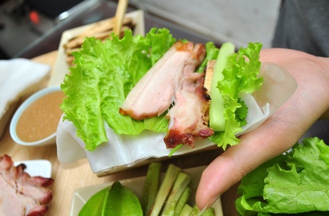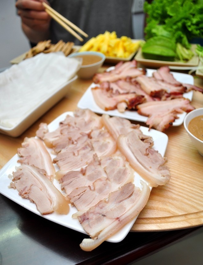 Bánh tráng thịt heo ở Hà Nội rất phổ biến, song phong cách lên mâm và đầy đặn thế này thì hiếm. Giá lại chỉ 120.000 đồng/suất, nên đây sẽ là bữa quà vặt lý tưởng cho nhiều cặp đôi hoặc chị em mê đồ cuốn. Nếu đi nhóm đông hơn, bạn cũng có thể gọi mâm cuốn này làm đồ khai vị, sau đó thưởng thức thêm lẩu hay các món chính khác.