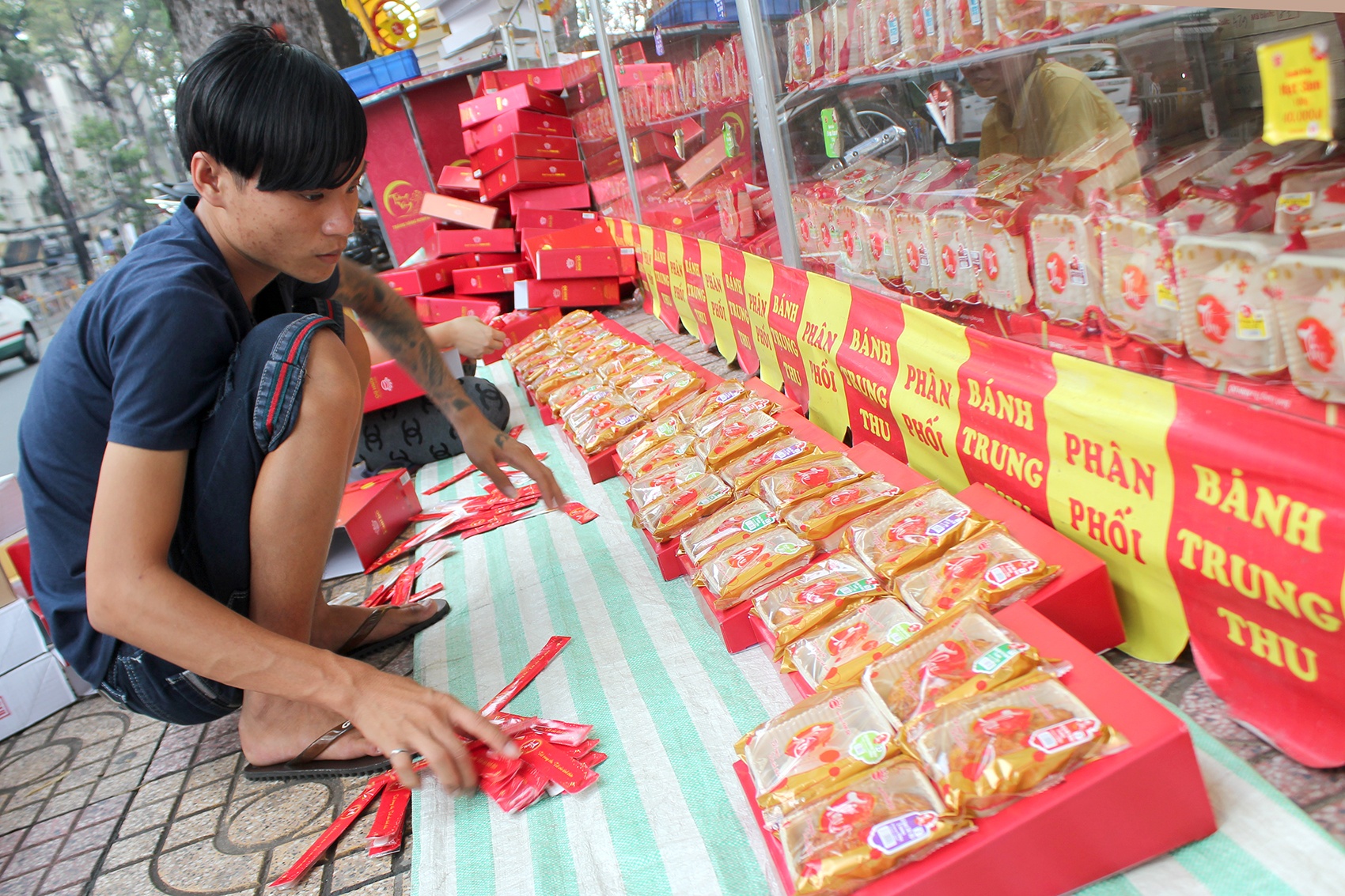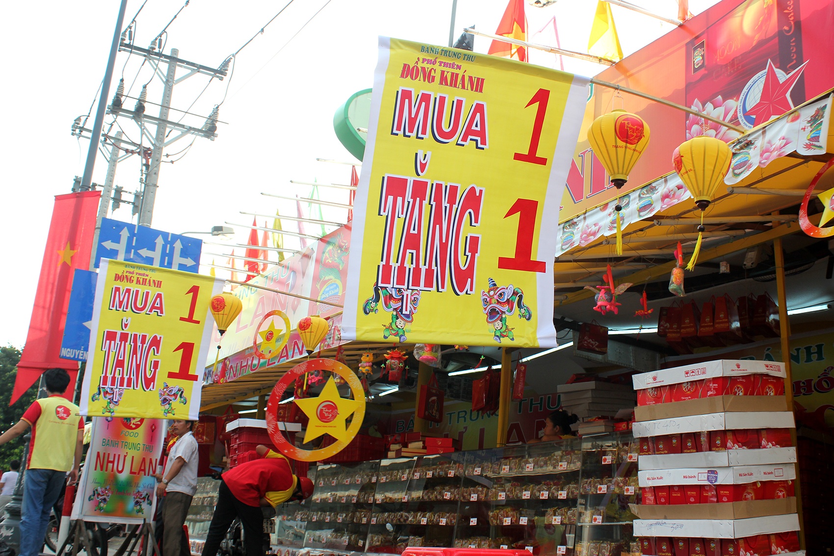 | 2 ngày nay, các quầy bánh trung thu trên nhiều tuyến đường lớn của TP.HCM như Nguyễn Tri Phương, Lý Thường Kiệt ,3 Tháng 2, Trường Chinh, Kha Vạn Cân... đã bắt đầu treo bảng giảm giá, khuyến mãi, dù còn cách rằm tháng tám đến 2 tuần. Một số thương hiệu giảm giá đến 50%. |