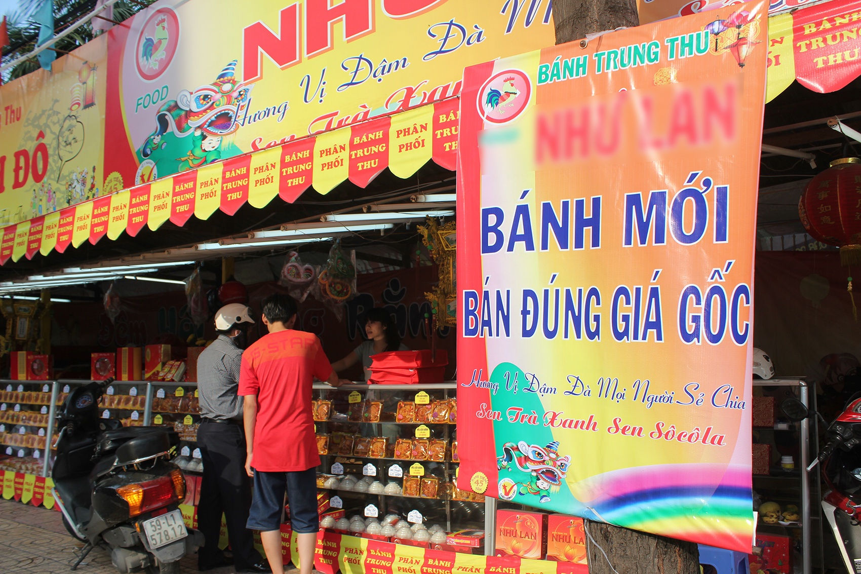 | Một thương hiệu bánh tru thu có tiếng ở TP.HCM không thông báo khuyến mãi kiểu mua 1 tặng 1, nhưng treo bảng cam kết bán bánh mới và giảm giá bằng với giá gốc. |