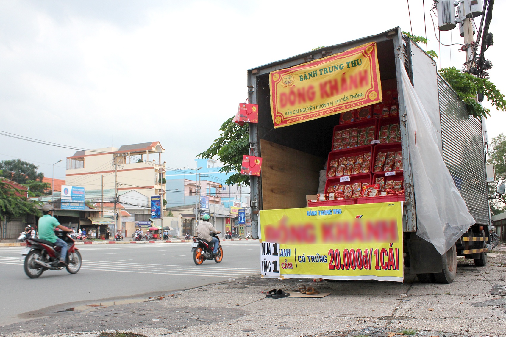 | Để tiết kiệm chi phí mặt bằng, anh Quân ở quận Bình Tân đã tận dụng chiếc xe tải chở hàng của mình để chở bánh đi bán ở nhiều địa điểm khác nhau. Giá bánh của "quầy" hàng này chỉ có 20.000 đồng/cái và khuyến mãi mua 1 tặng 1. |