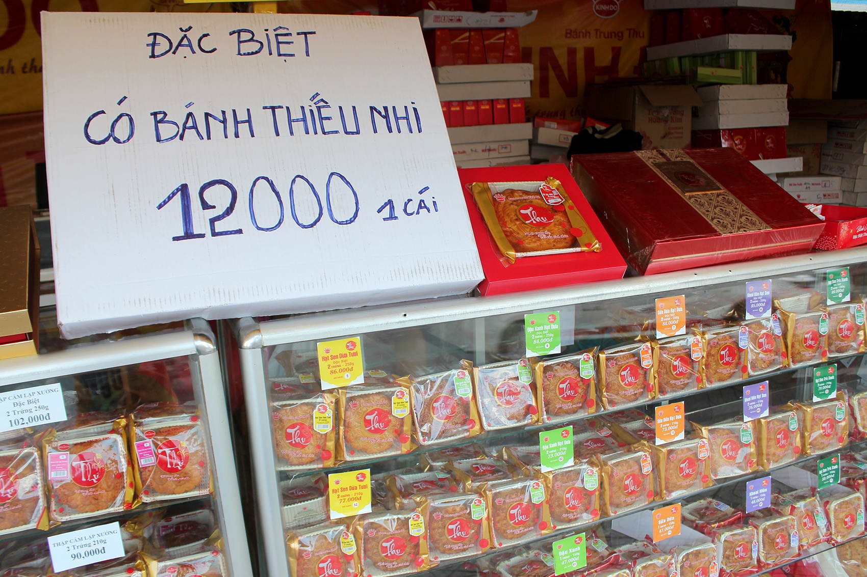 | Một số cửa hàng còn treo bảng bán bánh dành cho thiếu nhi với giá rẻ, chỉ 12.000 đồng/cái. |