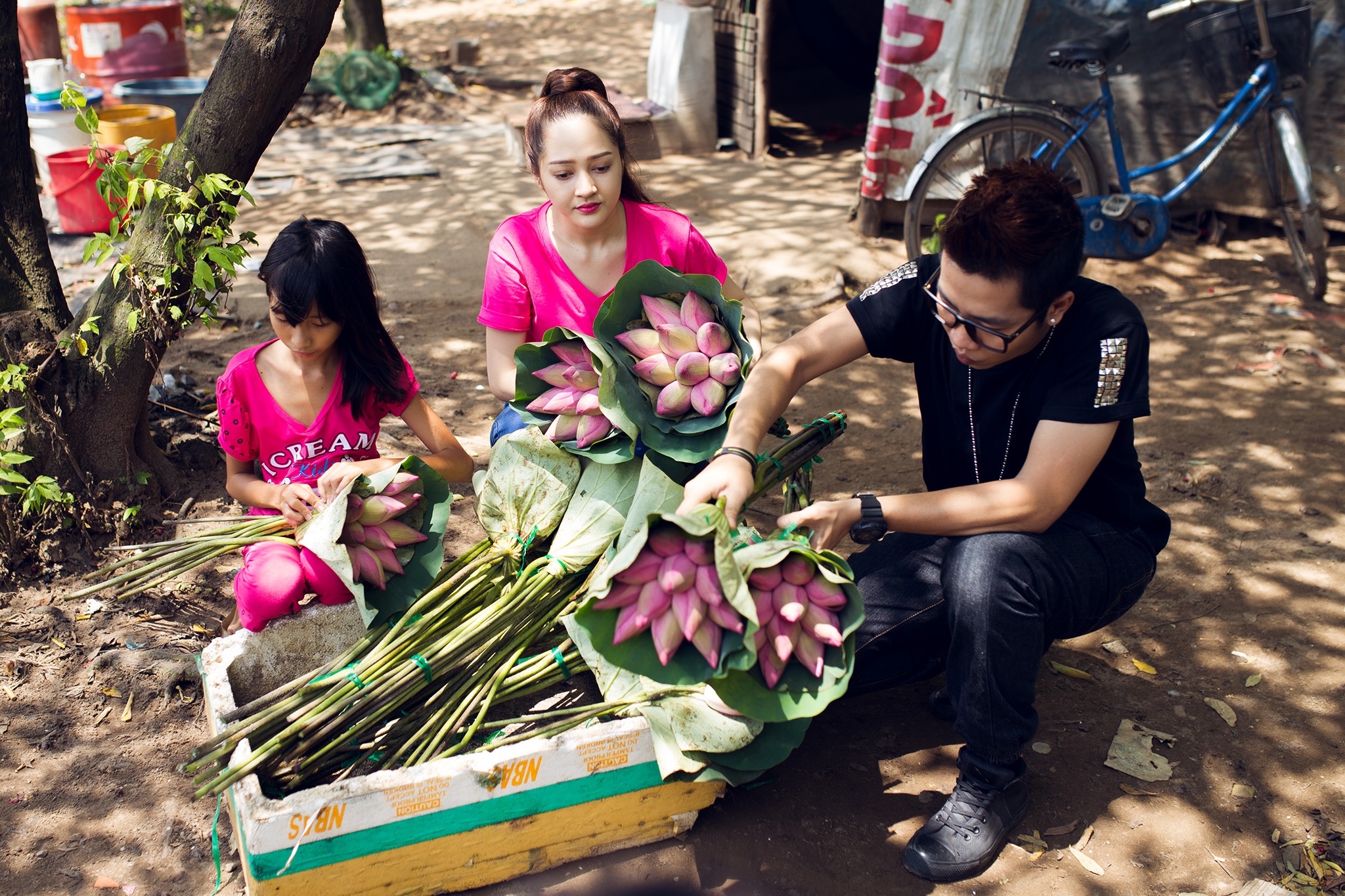 Nữ ca sĩ và đồng nghiệp ôm từng bó hoa sen xuống phố mời mọi người mua để kiếm tiền ủng hộ cô bé. Thông qua việc làm này, người đẹp hy vọng tất cả cùng giúp đỡ cho những hoàn cảnh bất hạnh. |