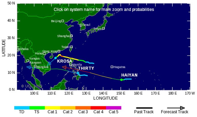 Dự báo tối 7/11, bão số 13 sẽ đổ bộ vào khu vực các tỉnh Nam Trung bộ và Đông Nam bộ nước ta. Khi bão số 13 vào bờ, nhiều khả năng cơn bão khác có tên quốc tế là Haiyan tiếp tục vào biển Đông trở thành cơn bão số 14. Vị trí và hướng di chuyển của bão Haiyan hiện tại gần giống với áp thấp nhiệt đới (mạnh lên thành bão số 13) nên nhiều khả năng sẽ tiếp tục ảnh hưởng đến quần đảo Trường Sa cũng như các tỉnh Nam Trung bộ và Đông Nam bộ.