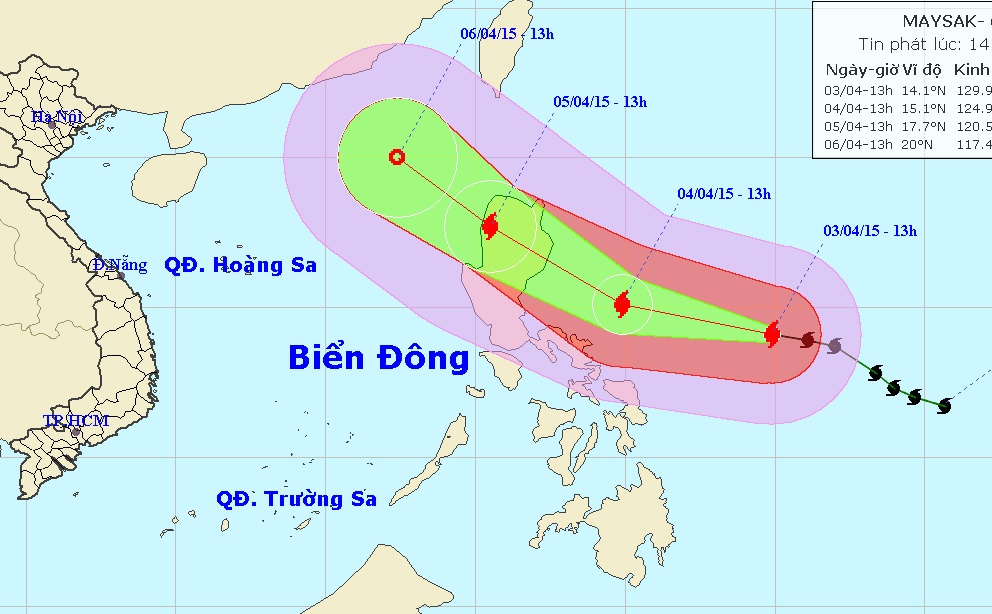 Theo Trung tâm dự báo Khí tượng thủy văn Trung ương, chiều 3/4, tâm bão Maysak cách đảo Luzon (Philippines) khoảng 900 km về phía đông đông nam. Sức gió gần tâm bão mạnh cấp 13 (134-149km/h), giật cấp 15-16.