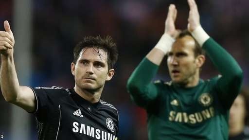 | Lampard chơi lăn xả nhằm cản phá cầu thủ Atletico. |