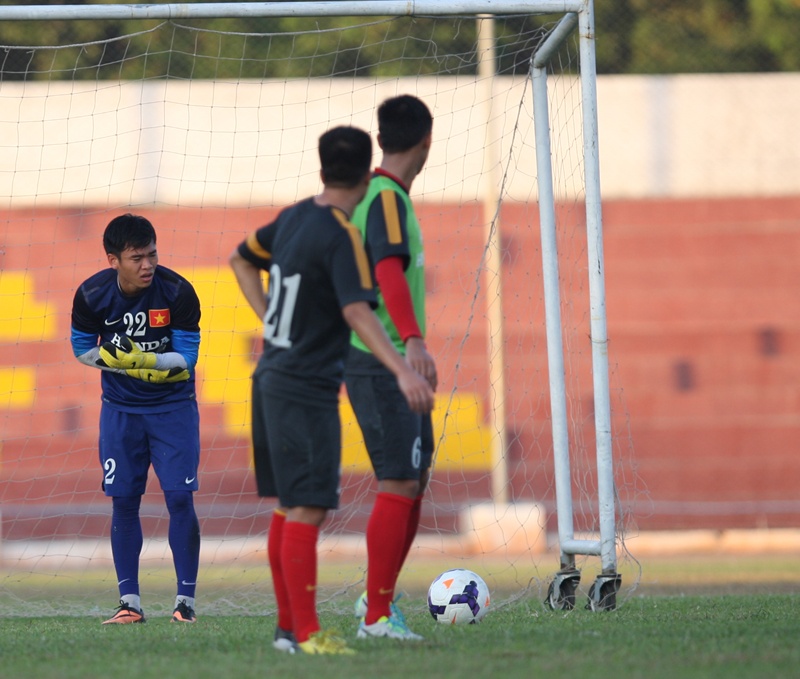 | Thủ môn Nguyên Mạnh cũng bị đau trong buổi tập chiều 6/12. |