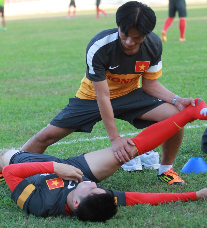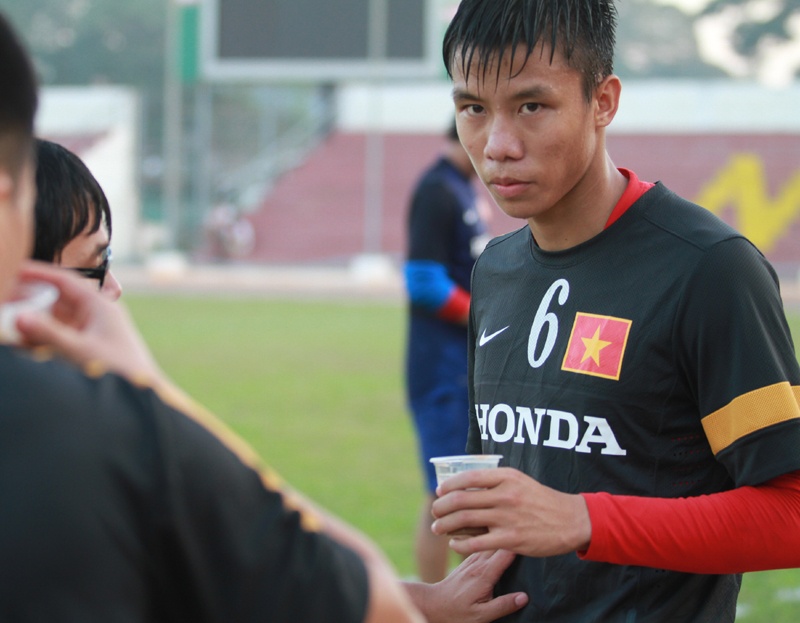 | Quế Ngọc Hải tập luyện với cái bụng đau. Ngày hôm qua bác sĩ nghi trung vệ này bị ngộ độc thực phẩm. |