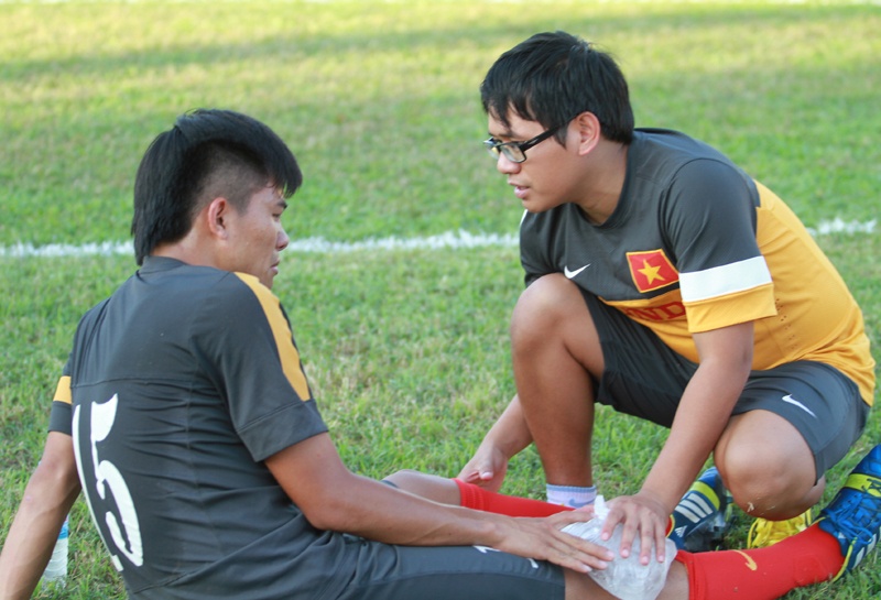 | Sau buổi tập, Mạnh Hùng phải chườm đá. Bác sĩ của đội cho biết tình trạng của Mạnh Hùng không quá nguy hiểm. |