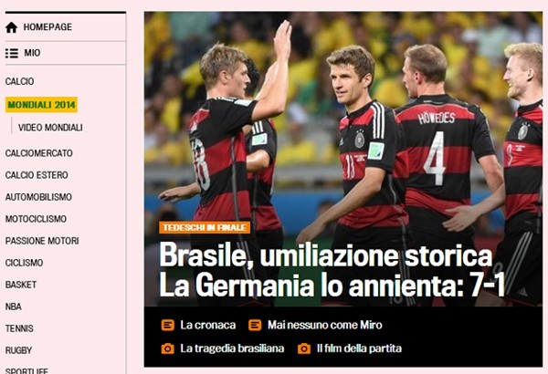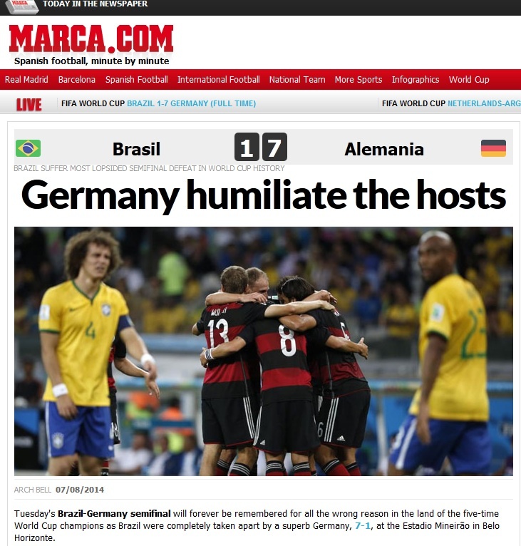 | Tờ Gazzetta dello Sport (Italy) miêu tả thất bại của Brazil như là một sự sỉ nhục. |