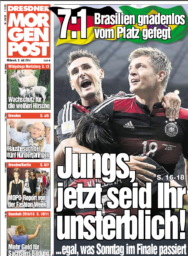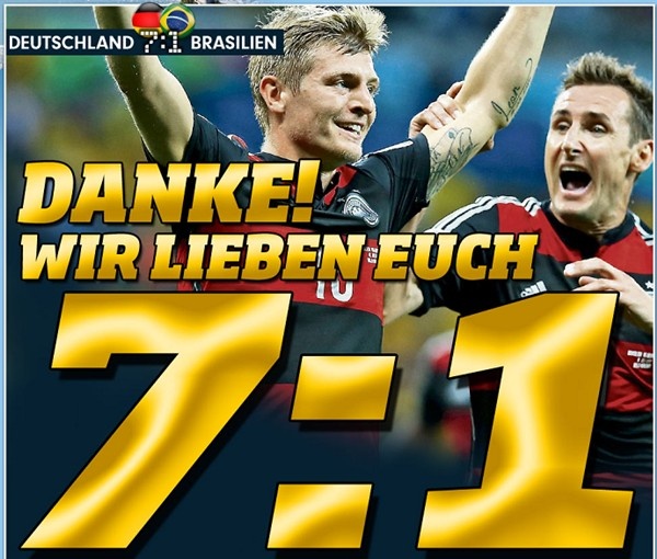 | Tờ Bild (Đức) nhấn mạnh vào tỷ số của trận bán kết giữa Đức và Brazil kèm theo dòng title: "Cảm ơn các anh, chúng tôi yêu các anh". |