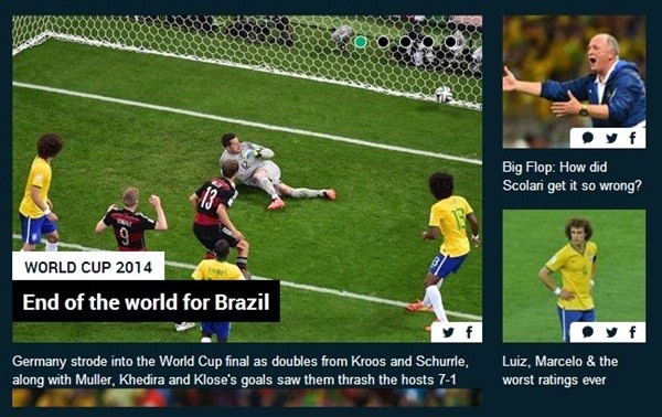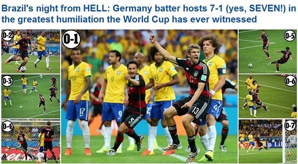 | Tờ Daily Mail (Anh) nói rằng đây là: "Đêm thảm họa của Brazil" đồng thời đăng tải hình ảnh 7 "nhát kiếm" mà người Đức tung ra về phía Selecao. |