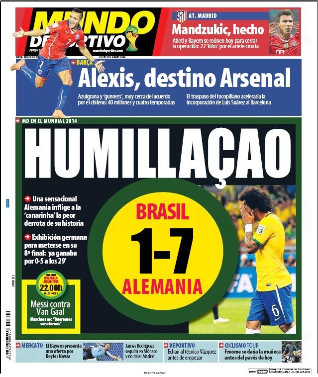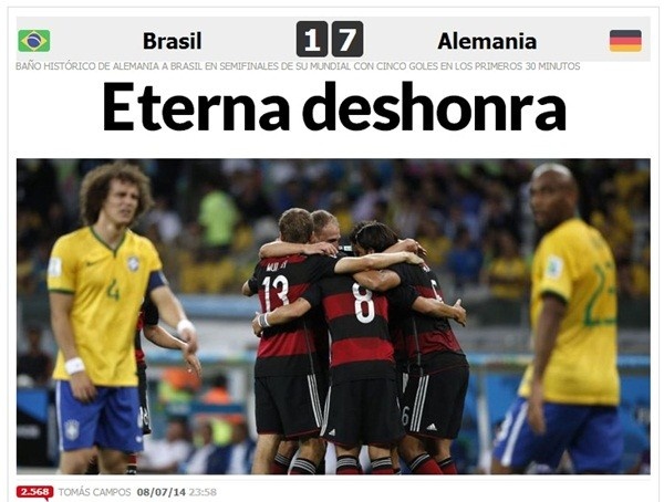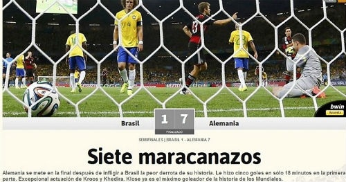 Tờ AS (Tây Ban Nha) nói thất bại của Brazil trước người Đức là "Thảm họa Maracana thứ hai". |