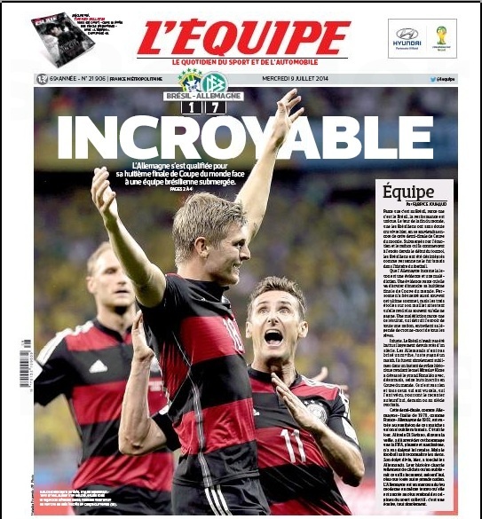 | "Không thể tin nổi" là tiêu đề trên trang bìa của tờ L'Equipe (Pháp) khi nói về chiến thắng của tuyển Đức. Dòng title cho thấy người viết bị rất sốc về kết quả trận bán kết giữa Brazil và Đức. |
