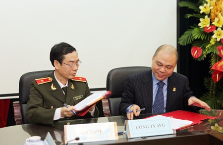 | Tổng biên tập báo Công an Nhân dân Phạm Văn Miên và ông Phạm Nhật Vũ - Chủ tịch HĐQT An Viên Group ký biên bản hợp tác giữa hai bên. |