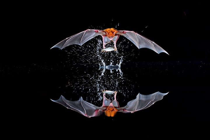 Con dơi mặt chó bắt cá trên hồ bao quanh đảo Barro Colorado, Panama. Cảnh tượng ngoạn mục này phản chiếu xuống mặt hồ. Ảnh: Bảo tàng Lịch sử Tự nhiên Mỹ.