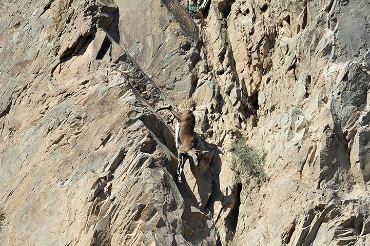 Con cừu lao xuống vách đá dựng đứng trên núi gần thành phố Ngân Xuyên, khu tự trị Hạ Ninh, Trung Quốc. Ảnh: Tân Hoa Xã.