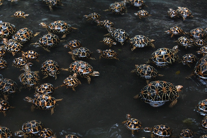 | Lính biên phòng Ấn Độ thả 925 con rùa sao để chúng bơi về phía Bangladesh sau khi họ tịch thu chúng từ bọn buôn lậu. Ảnh: Barcroft Media. |