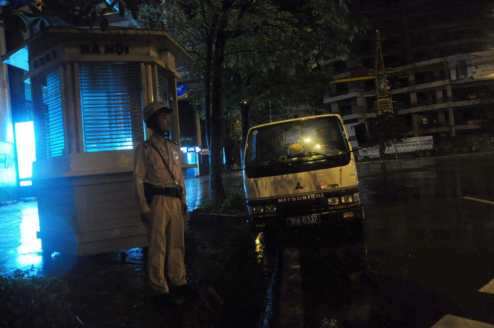 Tại các điểm giao thông trọng yếu hay xảy ra ngập úng, lực lượng CSGT vẫn cắt cử người ở lại canh gác đề phòng mưa bão lớn, đảm bảo trật tự và an toàn giao thông.