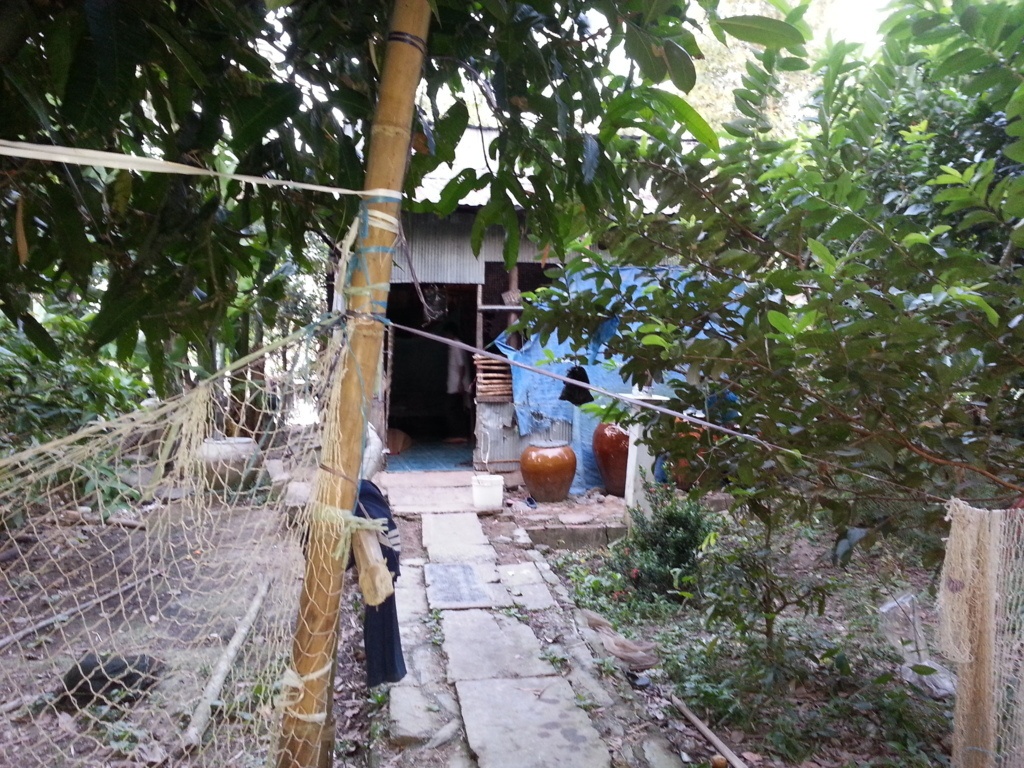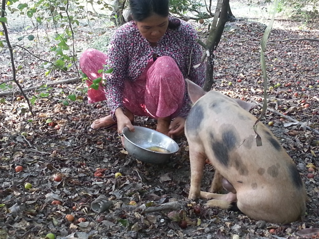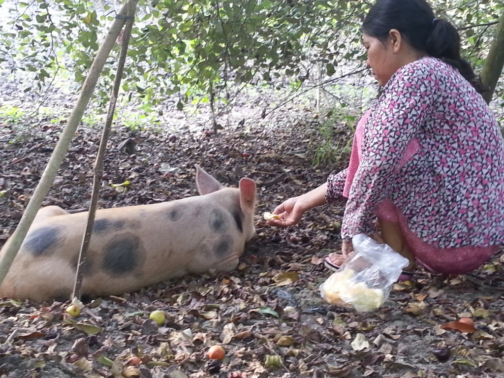 | Ông Đẩm mang con heo ra vườn nuôi chứ nhất quyết không bán. |