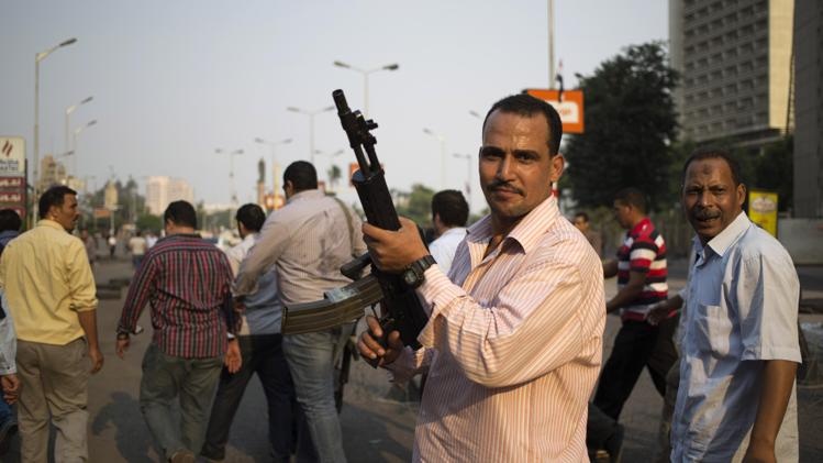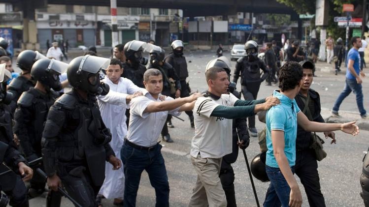 | Nhân viên an ninh mặc thường phục và những người ủng hộ quân đội bắt một người ủng hộ cựu tổng thống Morsi. Ảnh: AP. |