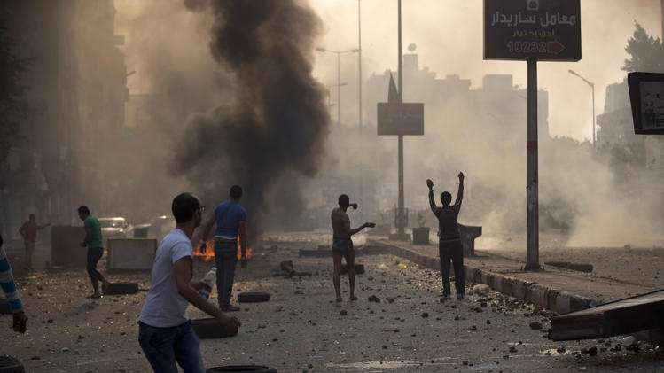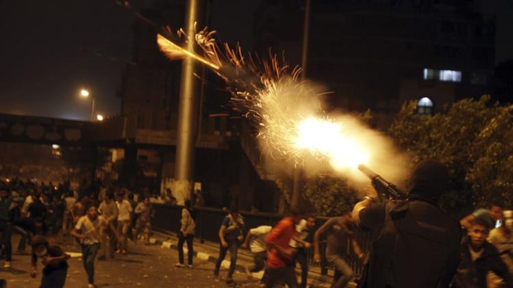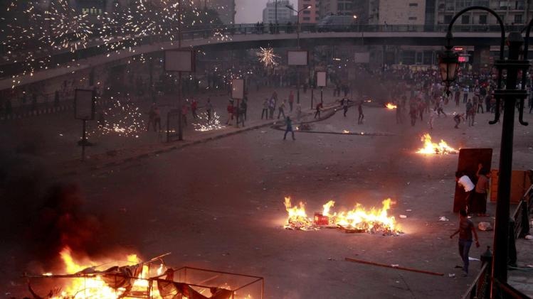 | Những người ủng hộ và phản đối cựu tổng thống Morsi ném gạch, bom xăng về phía đối phương trên những đường phố gần quảng trường Ramses vào tối 6/10. Cuộc chiến kéo dài nhiều giờ. Ảnh: AP. |