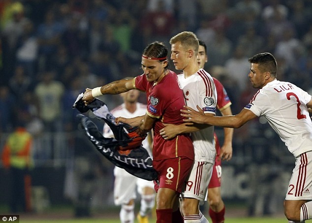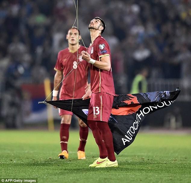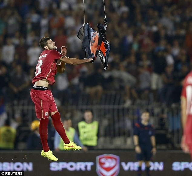 | Tiền đạo của Serbia, Aleksandar Mitrovic nhảy lên và giật lá cờ xuống. |