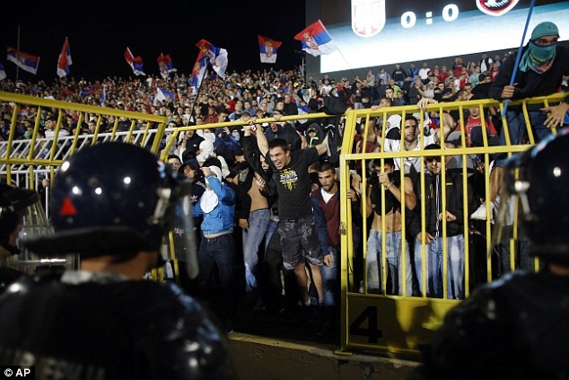 | Trong khi đó ở Serbia, hàng trăm CĐV quá khích mang theo quốc kỳ hò hét tiến về sân vận động. |