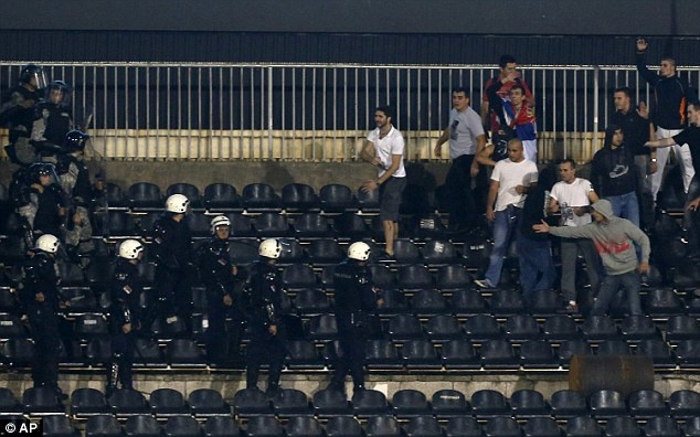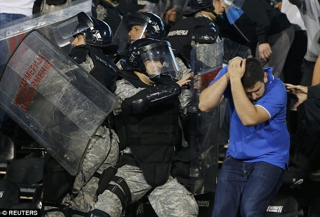 | Tuy nhiên, căng thẳng càng được thổi lên khi những CĐV quá khích trên khán đài ném các vật thể lạ vào các cầu thủ Albania. |