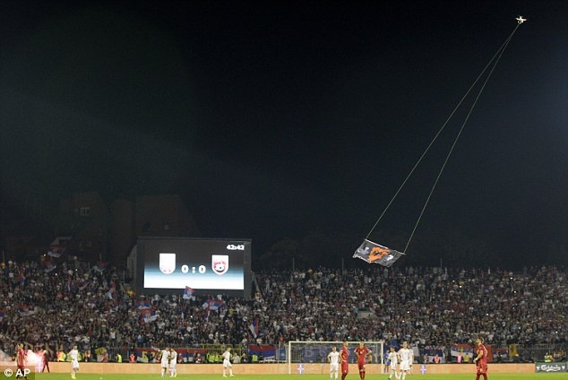 | Khi hiệp 1 trôi về những phút cuối thì một thiết bị bay không người lái được cho là của Albania mang theo lá cờ hình bản đồ Kosovo thả sát khu vực dưới sân. |